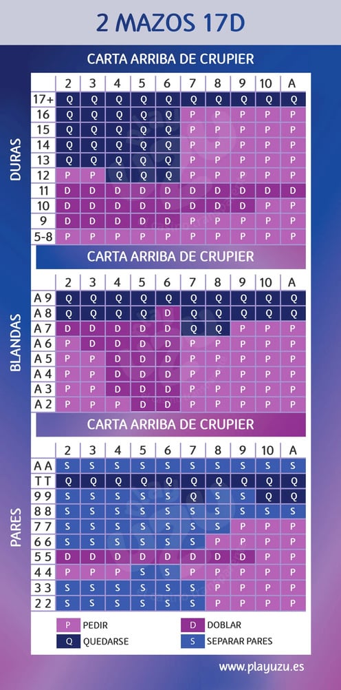 La tabla de estrategia de 21 o blackjack de 2 mazos es casi idéntica a la anterior, salvo en algunas decisiones puntuales al doblar. O al rendirse, si es posible.