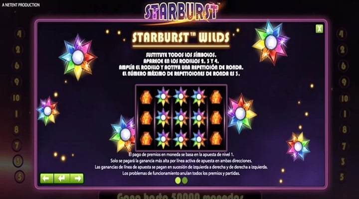 Con tantas líneas de pago en ambas direcciones, Starburst slots no necesita demasiados extras para convertirse en un juego TOP. Pero es que cuando aparece el comodín en alguno/s de los 3 rieles centrales, se activa la función Starburst Wilds. Esta mecánica funciona así: